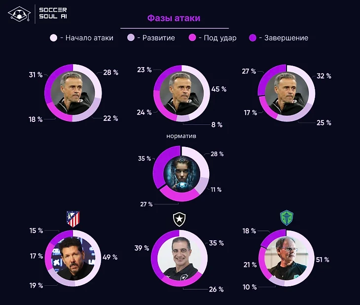 Если разложить показатель Soccer IQ на фазы атаки, то 35% действий в среднем приходится на завершение, 27% на предударное действие, 11% на фазу развития и 28% на фазу начала. Большая часть атак (речь об атаках через активно-выгодную позицию) пропускает фазу развития, поскольку в них, после стартового элемента сразу следует предударное действие.