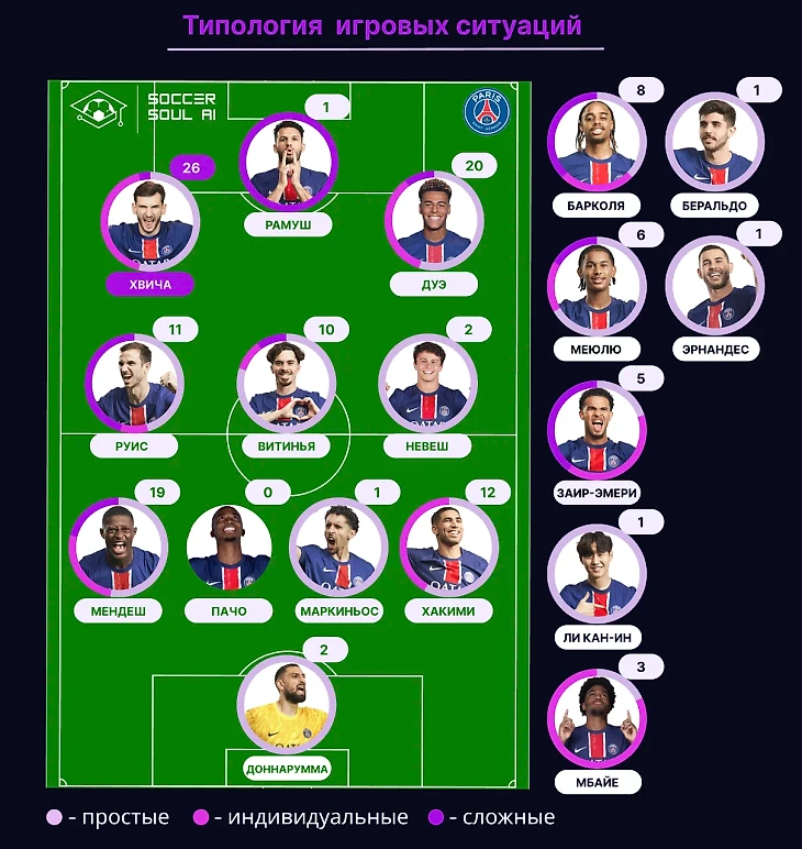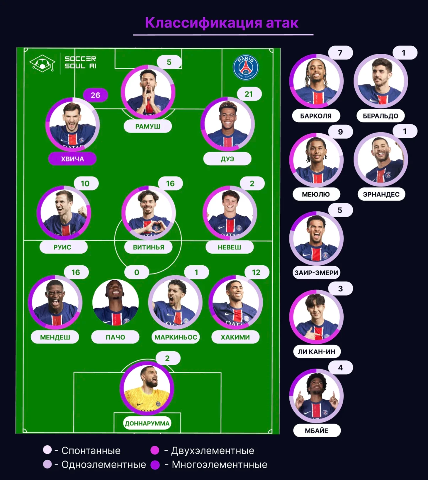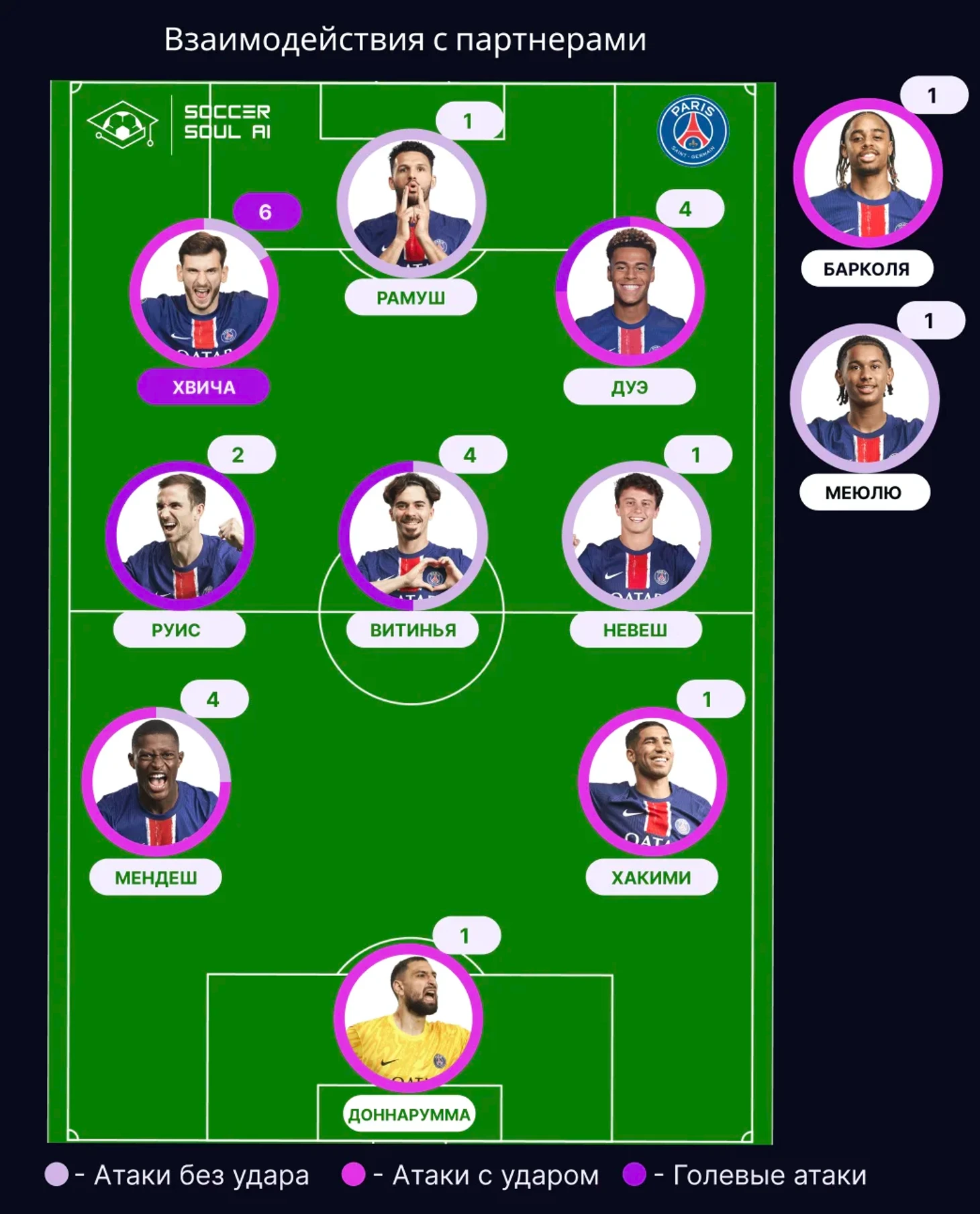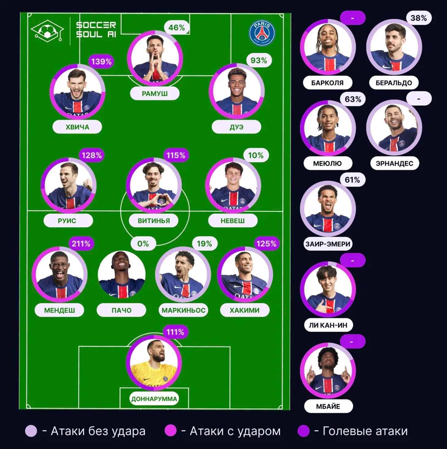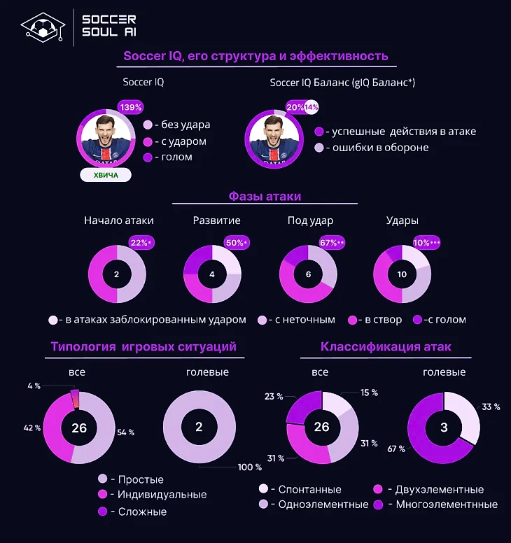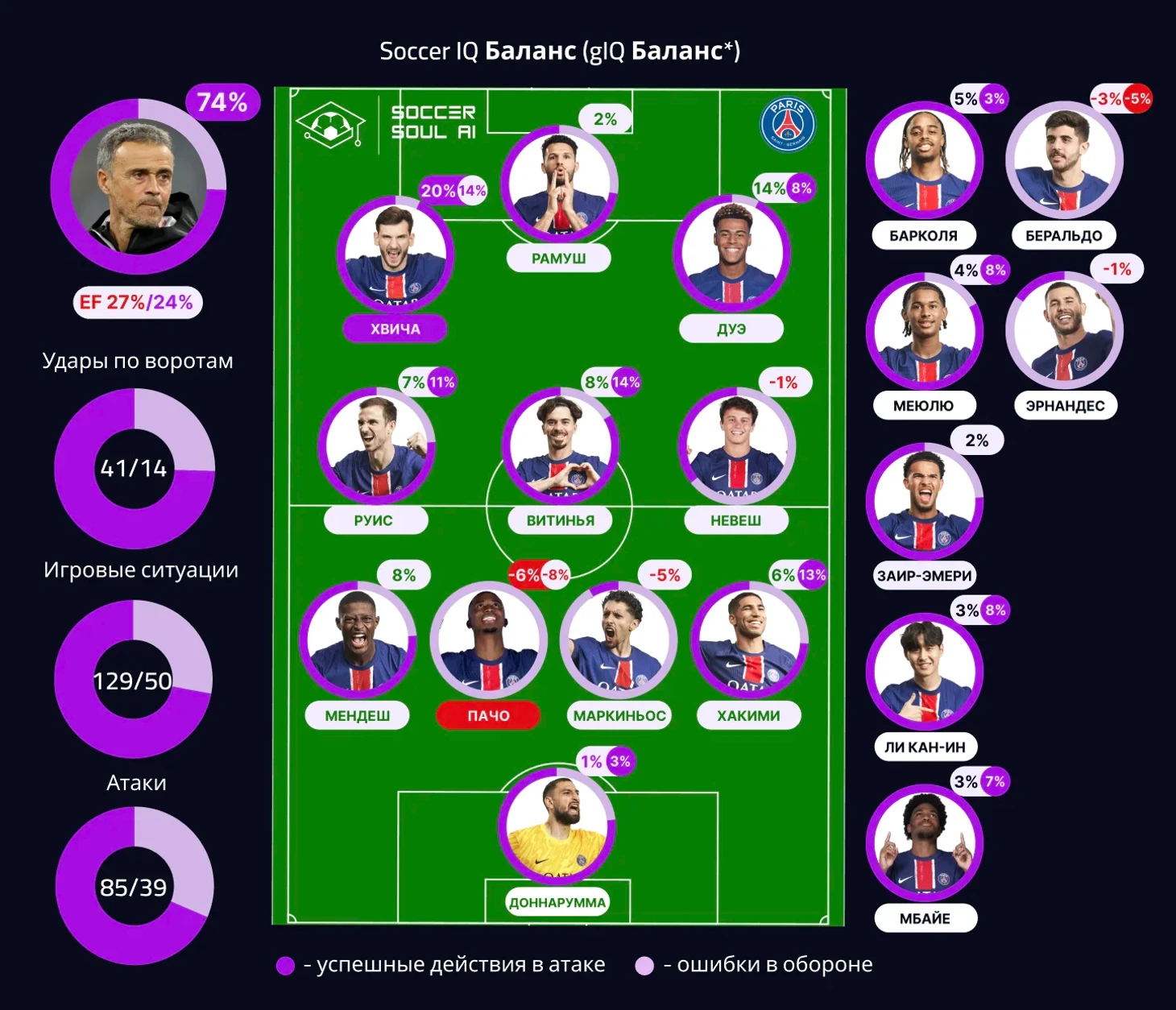 Стабильное перевыполнение Soccer IQ (139%), а также лучшие показатели вклада в командный Soccer IQ баланс (20%) и gIQ баланс (14%) определяют Кварацхелию, как лидера сегодняшнего ПСЖ, наиболее активного в ударной фазе, но также демонстрирующего прекрасные показатели в фазе развития и фазе предударного действия.