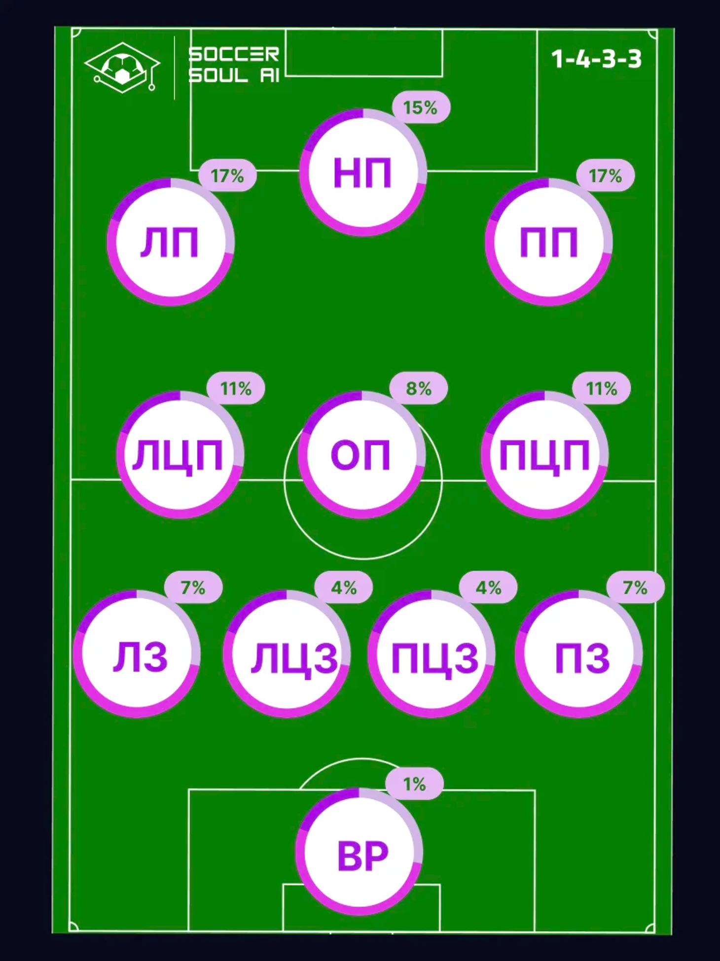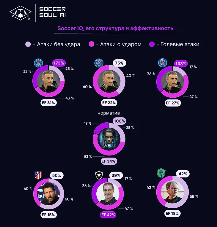 Учитывая игровую схему ПСЖ, статистически (на базе данных 650+ матчей) выведен стандарт для вклада футболистов разных игровых позиций, формирующих командную норму SoccerIQ. Для формации 1-4-3-3 почти половину атакующего качества формирует трио нападения. Конечно, при условии, что все игроки выполняют свой персональный норматив.