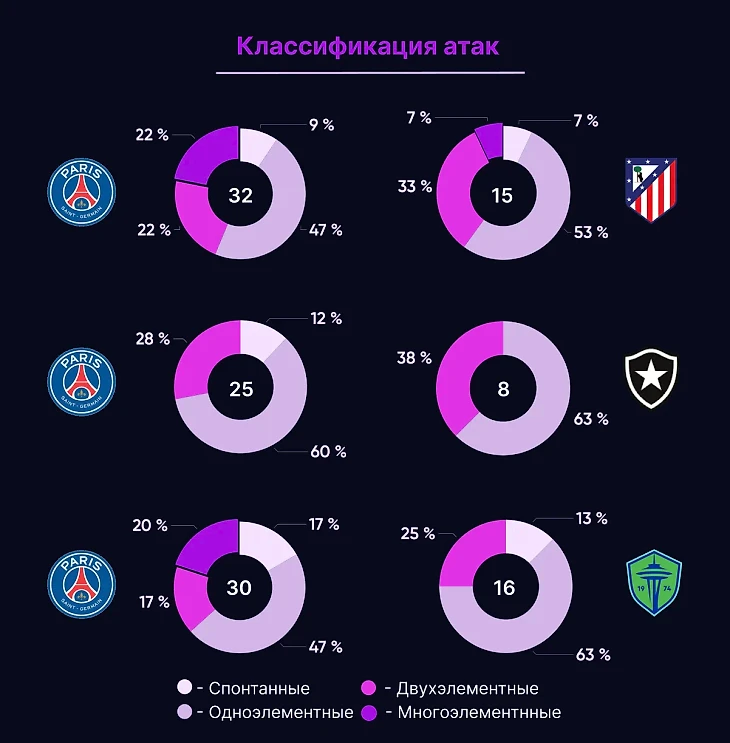 Фактически, две наиболее показательные и важные фазы – фаза развития и фаза завершения. Обе в матче с Ботафого у парижан были минимальны (23% и 8%). Низкое значение фазы развития особенно наглядно, поскольку в игре с бразильцами у французской команды возникли сложности по вскрытию оборонительных эшелонов, что отразилось на результате.