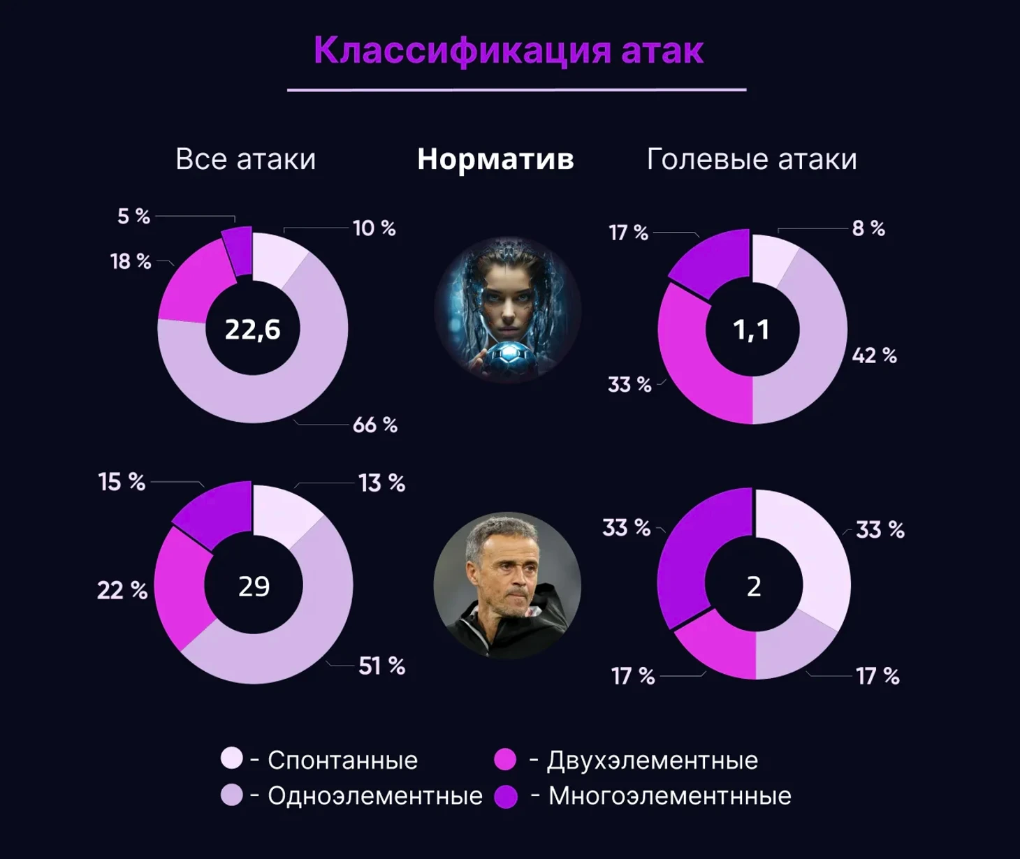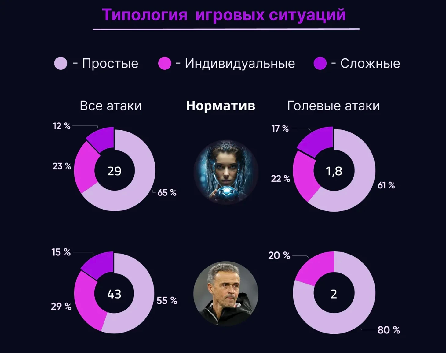 Стоит отметить, что у команды Энрике с начала сезона со сложными игровыми ситуациями отношения не простые. После первой трети сезона в голевых атаках они составляли только 4% - основным оружием команды были простые ситуации во многоэлементных атаках.