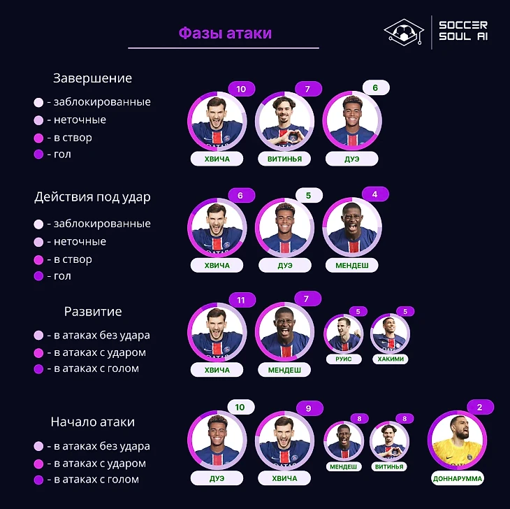Посмотрим на командных лидеров в разных фазах атаки. Кварацхелия, за исключением начальной фазы, лидирует во всех остальных. Да и в фазе начала атак, активнее его только Дуэ. Таким образом, Хвича задаёт тон всему командному движению.
