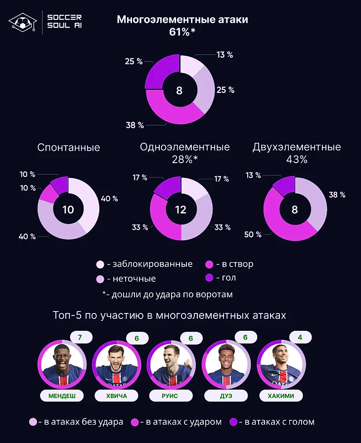 Многоэлементные атаки – это тот маркер качества, который у ПСЖ работает с начала сезона. Доля многоэлементных атак команды втрое выше среднего, голевых многоэлементных атак – вдвое выше среднего.