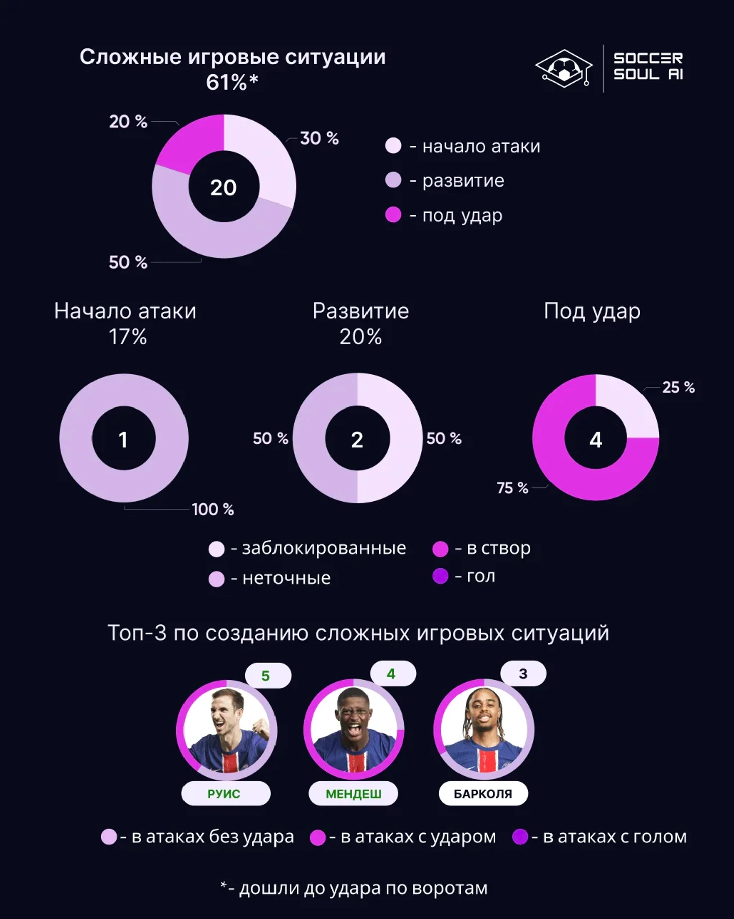Если сложная игровая ситуация начинала атаку, то статистически у парижан она доходила до удара в 17% случаев. Если сложная была в фазе развития, то удар случался в 20% случаев. В случае сложного, как предударного элемента, в 75% мяч попадал в створ. Наиболее часто создававшие сложные ситуации футболисты – Руис, Мендеш и Барколя.