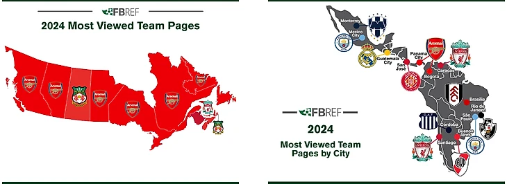 Уверенно побеждают «канониры» и в Канаде, а вот в Центральной и Южной Америках уже другие любимцы.