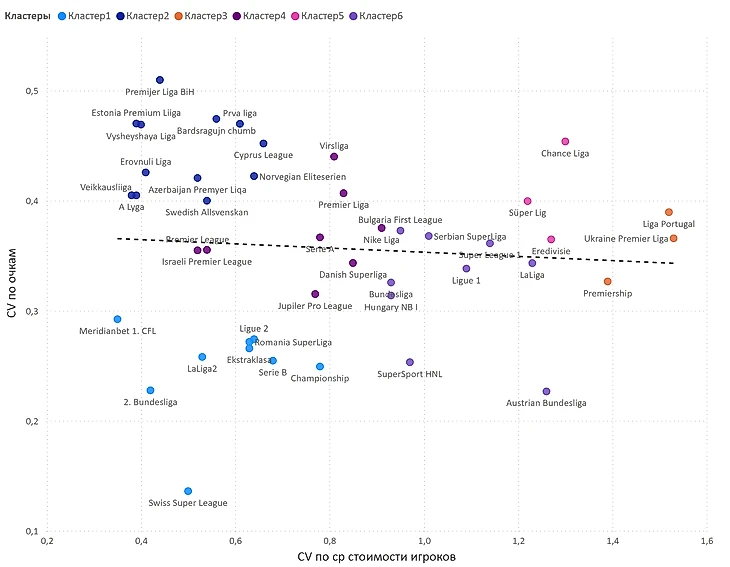 Интересно, что чемпионат Азербайджана по рейтингу конкурентности на основе средней стоимости игроков попадает на одни из верхних строчек рейтинга, а на практике самая худшая конкуренция среди крупных лиг Европы. Сравнение рейтингов лиг по разбросу стоимости составов и набранных очков (включая сводный рейтинг по очкам+голам) в сезоне 2024-2025 не показывает значимой корреляции. Можно только выделять различные кластеры (групп с похожими значениями CV по обоим рейтингам). Относительно большой разброс по средней стоимости игроков вместе с низким разбросом очков в 10-12 лигах (кластер 2). Только примерно в 15 лигах можно проследить одинаковую тенденцию по обоим показателям (кластеры 1, 5, 6). Остальные чемпионаты показывают средний уровень конкурентности по всем параметрам.
