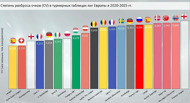 По этим данным считаем разброс между позициями за каждый сезон с помощью коэффициента вариации (CV), а затем берем среднее за 5 сезонов. Чем ниже CV, тем меньше разрыв между командами – значит, лига более конкурентная.