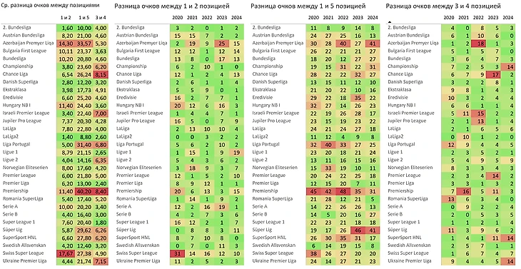 В среднем за 5 сезонов наименьшая разница между 1-м и 2-м местами в «Ла Лиге 2» (1,4 очка), в «Бундеслиге 2» (1,6 очка), в «Датской Суперлиге» (2,8 очка); наибольшая разница в «Швейцарской Суперлиге» (17,7), «Азербайджанской Премьер-лиге» (14,3), в Шотландии (11,4) и Венгрии (11,4). 5-е место ближе всего к чемпиону в тех же лигах, а дальше всего — снова в Шотландии и Азербайджане, а на третьем месте – «Лига Португалии». В борьбе за медали (разница между 3-м и 4-м местами) по плотности лидирует греческая «Суперлига 1» (1,8 очка), на втором месте – «Российская Премьер-лига» (2,4 очка), далее идет «Ла Лига 2» (2,6 очка).