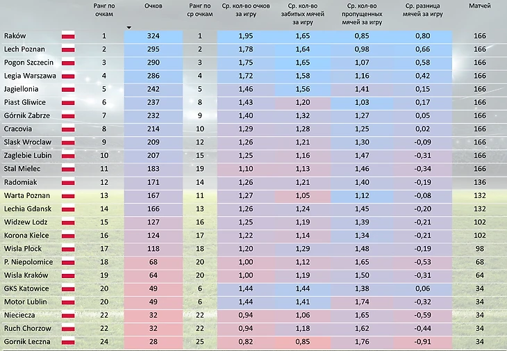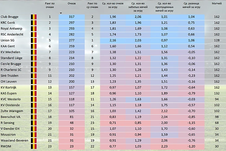 Используем статистический анализ разброса очков и голов между турнирными позициями в высших и вторых дивизионах топ-5 ассоциаций за последние 5 сезонов. Подробнее: