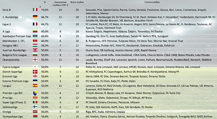 Больше всего уникальных клубов в топ-3 было в «Серии Б» (14), «Бундеслиги 2» (12), «Лиги 2» (11) и «Чемпионшипе». Среди высших лиг больше всего клубов с медалями в чемпионатах Болгарии (8), Беларуси (8), России (7) и Швеции (7). Среди высших лиг наибольшая доля клубов с медалями в чемпионатах Литвы, Азербайджана и Черногории.