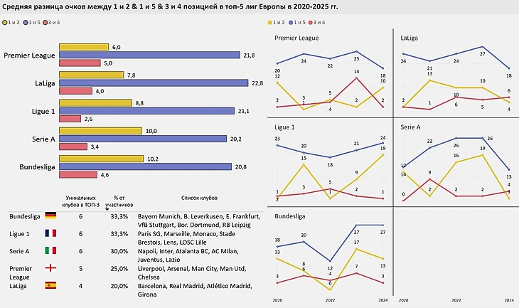 Последние 5 сезонов борьба между верхними двумя клубами была острее в «Английской Премьер Лиге» (6 очков отрыва). Отрыв чемпиона от 5 места меньше всего в итальянской «Серии А» (20.2 очка). Борьба за бронзу ожесточнее всего во французской «Лиги 1» (2.6 очка). Наимньшая борьба за чемпионство в «Бундеслиге» (10.2 очков отрыва), наибольший отрыв чемпиона от 5 места в испанской «Ла Лиге» (22.8 очка), а 3 место дальше всего от 4 в «АПЛ» (на 5 очков).