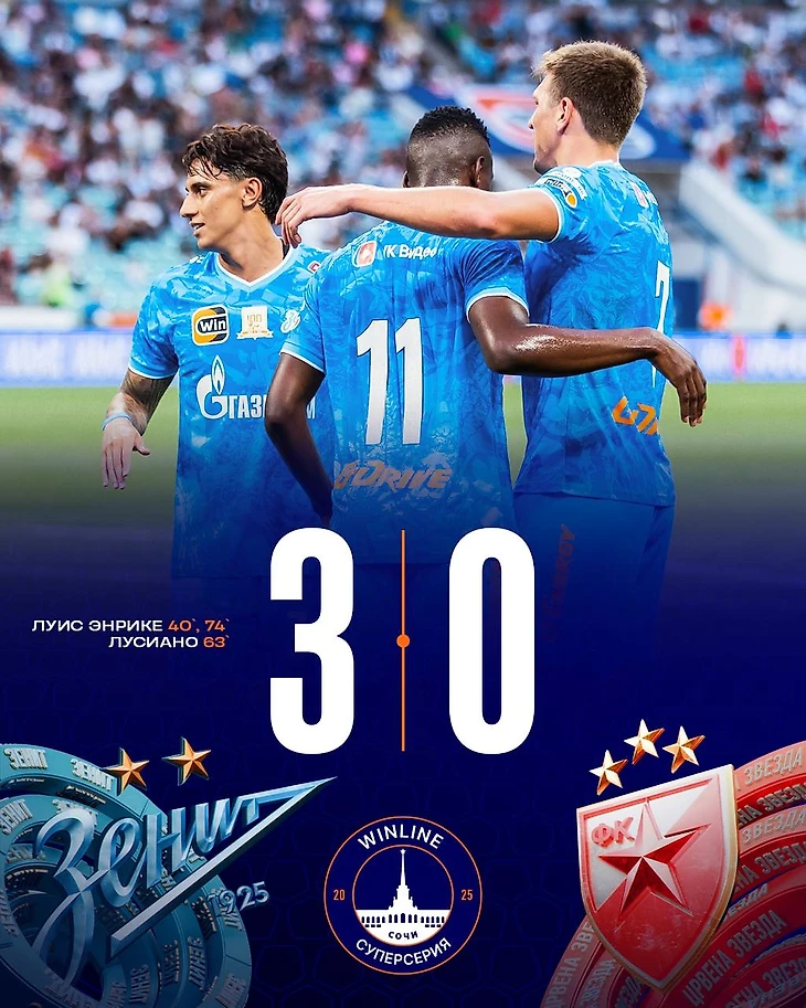 Петербургский Зенит 29 июня в рамках «winline суперсерия» обыграл Црвену Звезду, забив З безответных мяча. Несмотря на то,что матч был товарищеским на него пришло более ЗО тыс болельщиков, матч проходил не на Газпром Арене, а на стадионе Фишт, в Сочи.
