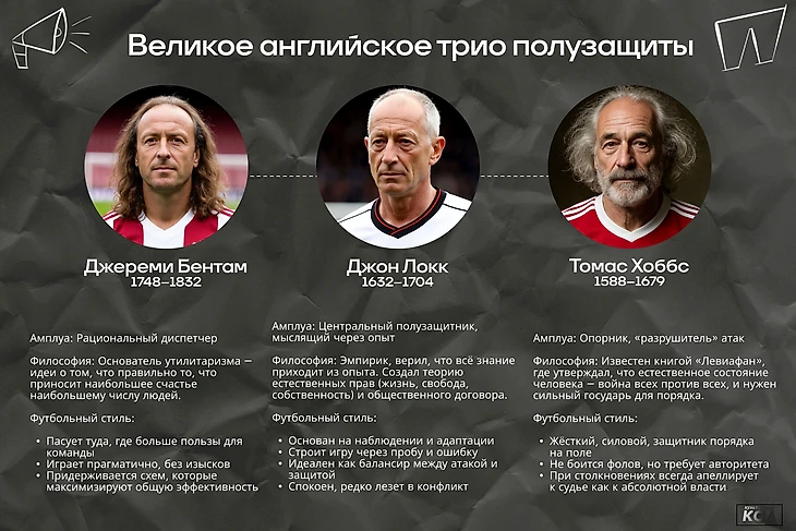 Нам известно, что Германия на пути к грекам обыграла «знаменитое трио полузащитников Англии: Бентама , Локка и Хоббса». Команда англичан была симпатичным открытием олимпийского философского турнира.