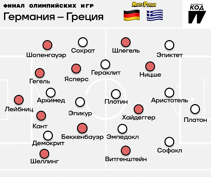 Путь команд философов к финалу: Германия выиграла у англичан, греки (возможно) у русских, которых подвел тренер