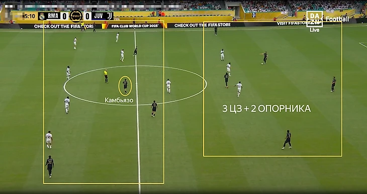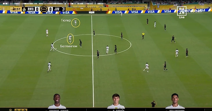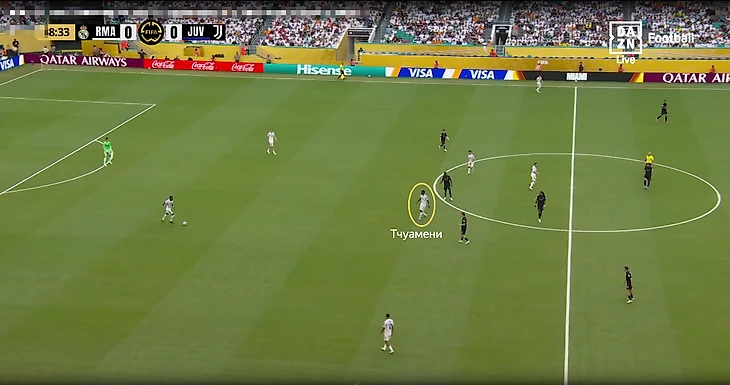 Второй матч подряд Хаби Алонсо выбирал схему с тройкой центральных защитников. В такой расстановке место самого центрального в тройке занимал Тчуамени. Против «Ювентуса» еще по ходу первого тайма позиция француза изменилась – теперь Орельен располагался в центре поля.