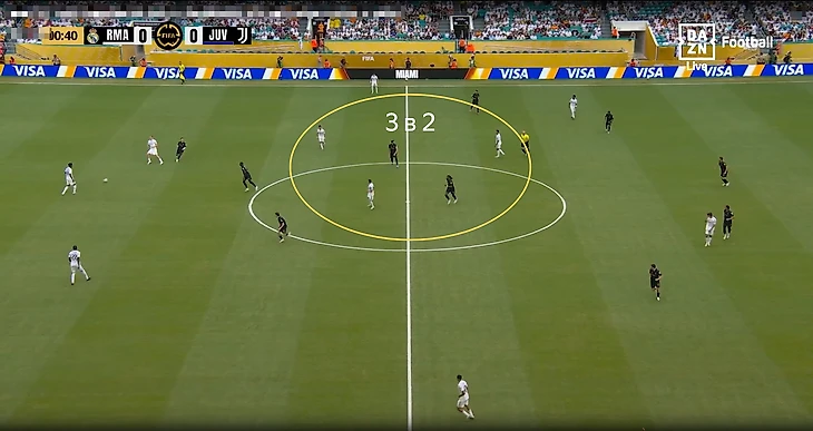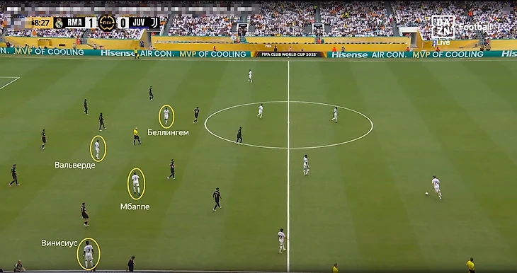 По цепочке пустота образуется в центре атаке, где нет классического центрального нападающего (Гонсало Гарсию заменили). За заполнение центра атаки в такой конфигурации отвечали Беллингем и Вальверде, которые своими рывками заполняли штрафную.
