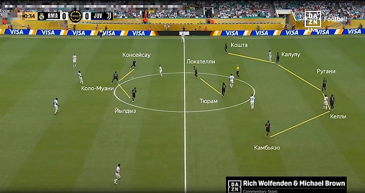 Схемы команд накладывались друг на друга таким образом, что нередко в центре поля «Мадрид» имел численное преимущество 3 в 2. Атакующая тройка «Ювентуса» ориентировалась на центральных защитников «Реала», а вот в центре двух опорников зачастую не хватало, чтобы перекрыть всех полузащитников соперника.