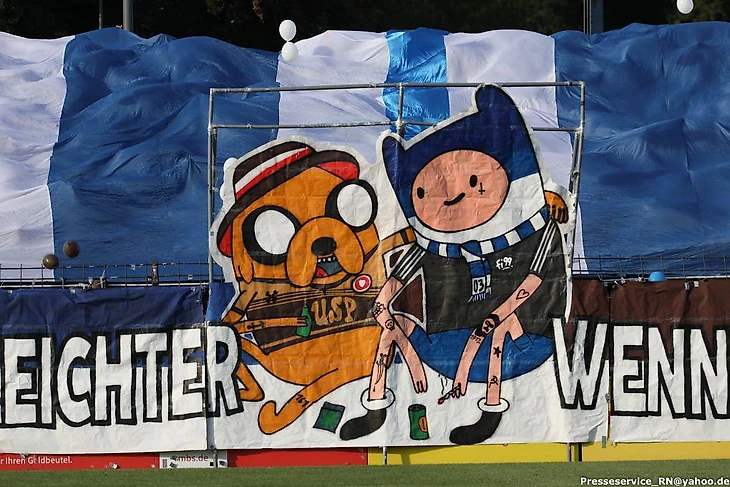 Этот сериал рассказывает о приключениях мальчика Финна и его друга — волшебного пса, английского бульдога Джейка в постапокалиптическом мире, называемом «Земли Ооо». Собственно они и изображены в виде фанатов клубов.