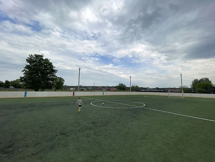 Около футбольного поля был и хоккейный каток – надо сказать, что первенство Гусевского района по хоккею тоже есть, и Золотково в нём играет. На катке, конечно, не было льда, но было искусственное покрытие, пара ворот и заботливо оставленный кем-то мячик. Тимофею всё это понравилось, и мы с ним практически впервые позабивали голы в ворота.