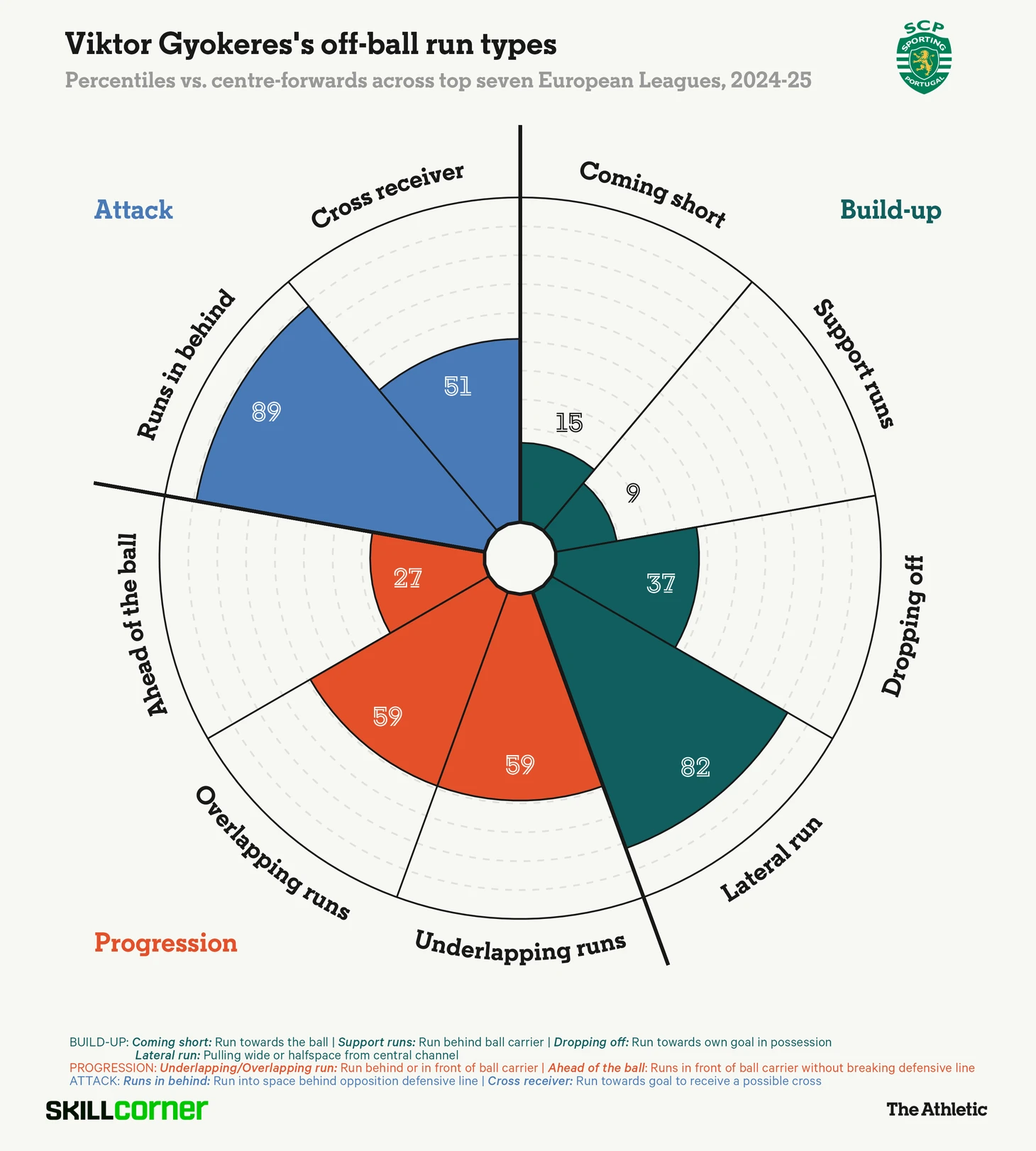Карта перемещений Дьокереша от ресурса SkillCorner, сравнивающая его движение с форвардами из топ-7 европейских лиг, показывает, что швед едва ли не чаще всех «девяток» в Европе забегает в пространство за спины защитникам и в свободные зоны на флангах.
