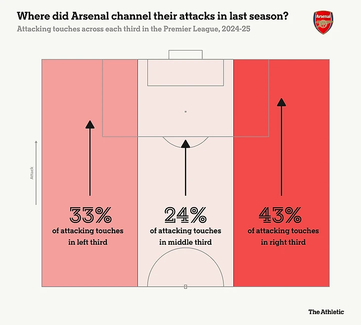 В прошлом сезоне АПЛ только 32,9% атакующих касаний «канониров» пришлись на левую треть поля, что является самой низкой долей среди всех команд Премьер-лиги. Они не смогли продвигать мяч по левой стороне с той же эффективностью, с которой им это удавалось делать это справа.