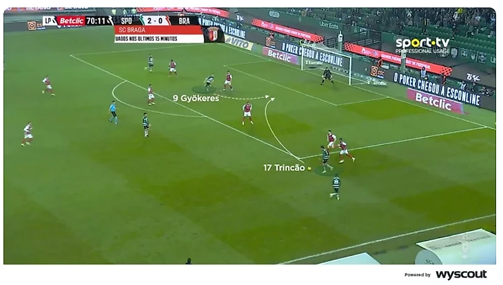Дьокереш умело использует свои скорость и стартовый рывок для того, чтобы врываться в свободное пространство за защитниками. Швед совершает криволинейные забеги из центральных позиций в более широкие зоны. Особенно часто и эффективно он делает это, когда крайние защитники находятся не на своих позициях, как на примере ниже.