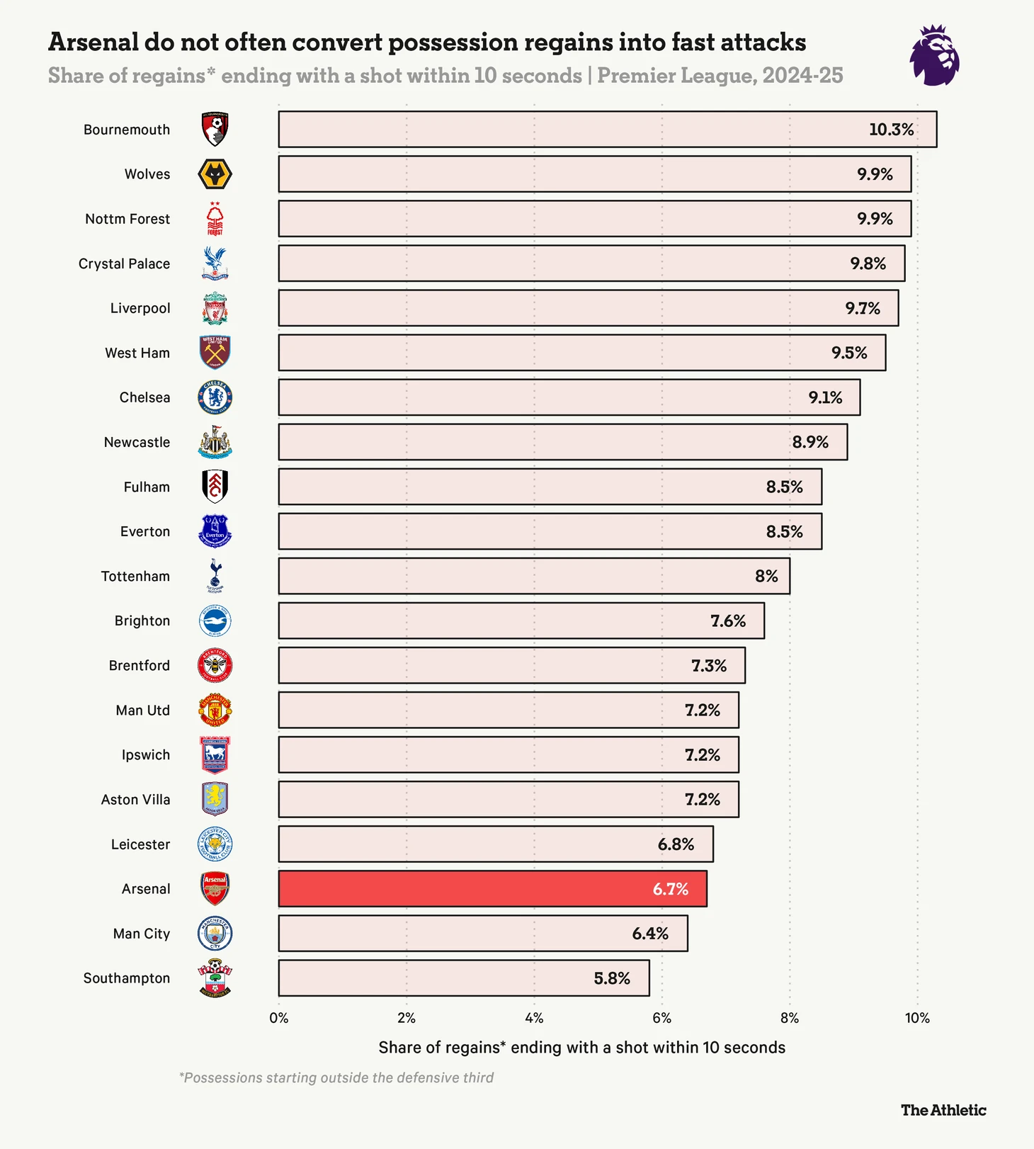В прошлом сезоне АПЛ только «Борнмут», «Ньюкасл» и «Ливерпуль» возвращали себе мяч за пределами своей трети поля чаще, чем «Арсенал», но, как показано на графике ниже, только 6.7% быстрых атак «Арсенала» после возвращения владения заканчивались ударом по чужим воротам в течение 10 секунд после возврата мяча. Это третий с конца показатель в чемпионате за прошлый сезон.