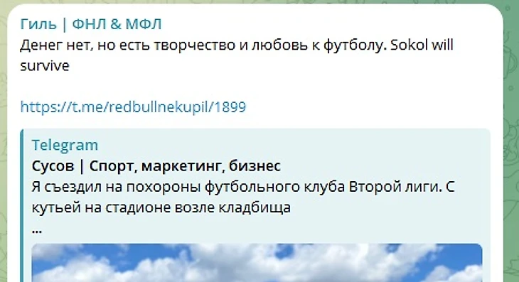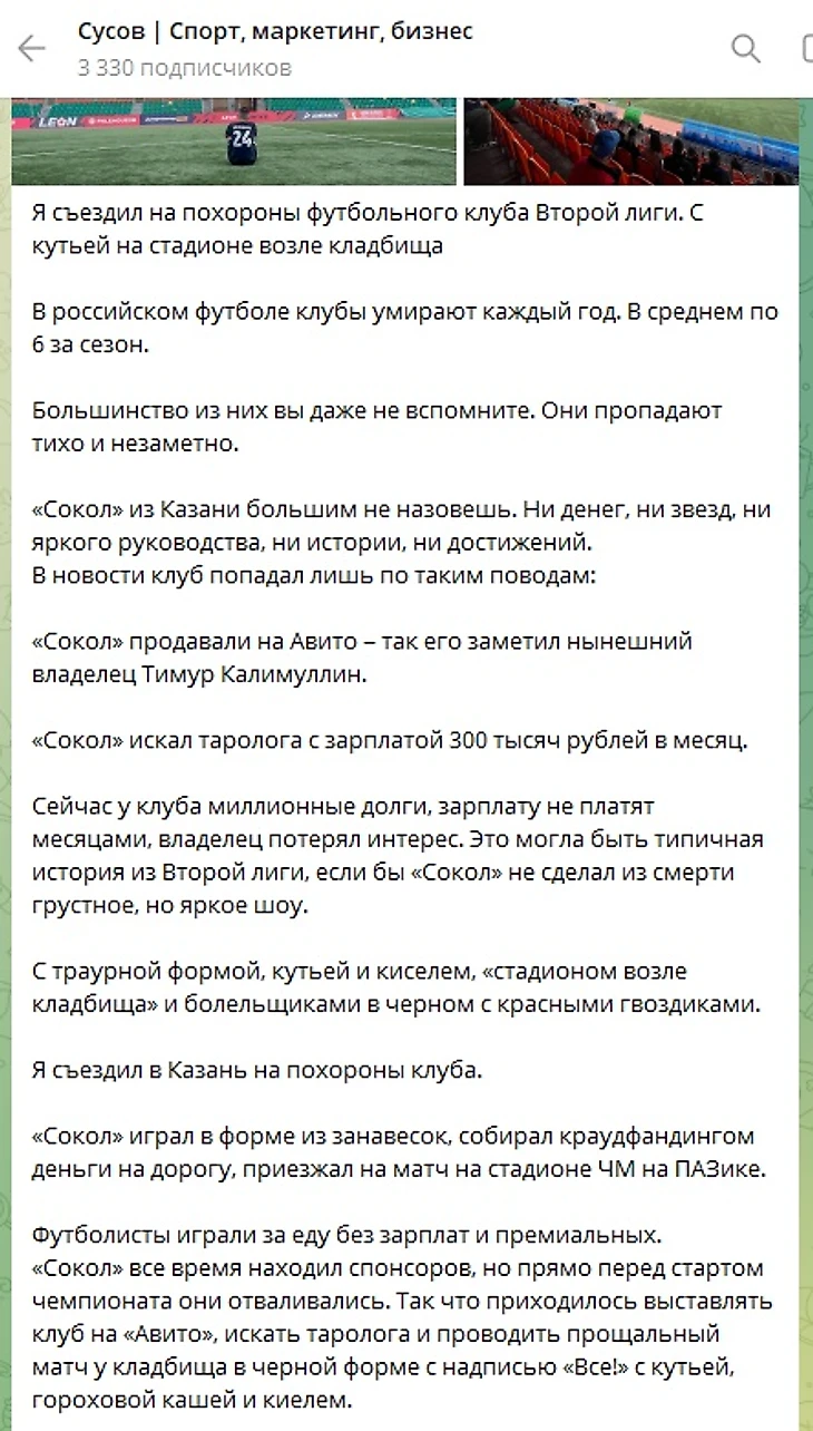 4) и самое главное: после проведения последнего матча, после массового появления инфы про похороны клуба в СМИ - у них вдруг появился потенциальный покупатель и именно в тот момент когда чемпионат ушел на паузу. Ну еще раз-почему в казанском клубе, где все руководители местные, хоронят клуб с отсылкой на православные традиции? Им в соцсетях даже свои же подписчики на это указывали, но смм оставили это без ответа.