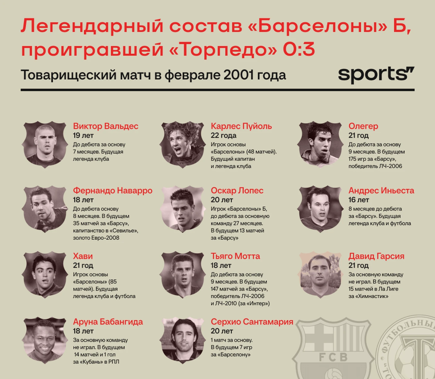 Февраль 2001-го. «Торпедо» готовится к новому сезону после лучшего года в российской истории (бронзовые медали чемпионата и выход в Кубок УЕФА). На сборах в Испании клуб проводит товарняк со второй командой «Барселоны». Рядовой матч, если бы не одно «но»: это был великий дубль каталонцев по количеству будущих легенд – суммарно 16 титулов ЛЧ за «Барсу» и 1 гол за «Кубань».