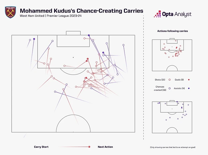 Из 47 игроков, на счету которых 25+ продвижений с мячом, после которых последовал удар или созданный шанс, Кудус был единственным, кто не смог записать на свой счет голевое действие. Отчасти это заслуга его товарищей по команде, но всё же это заметный недостаток его прошлого сезона, и ему нужно будет улучшить этот показатель.
