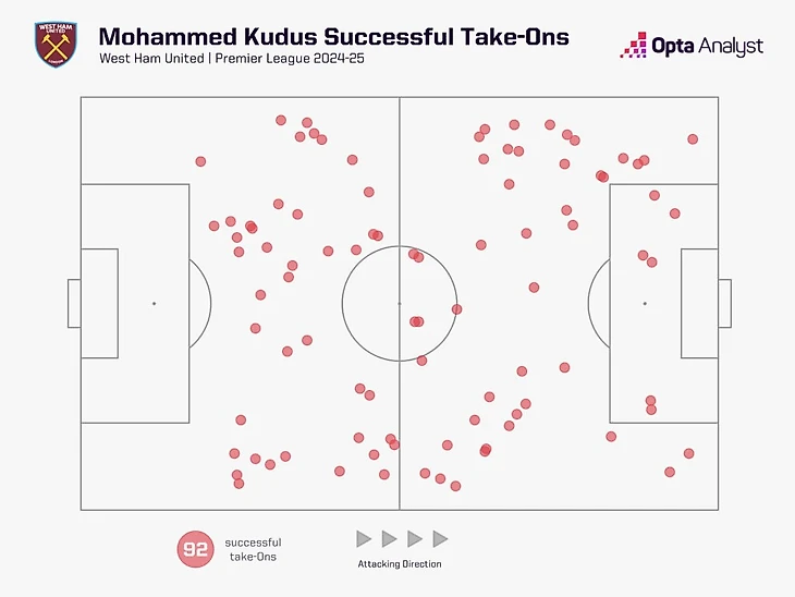 Кудус - действительно элитный дриблёр. Только игрок «Манчестер Сити» Жереми Доку совершил больше успешных обводок (107) в Премьер-лиге в прошлом сезоне, чем Кудус (92). В среднем за 90 минут лишь у Доку (6,4) показатель лучше, чем у Кудуса (3,2) среди игроков, сыгравших минимум 1000 минут.