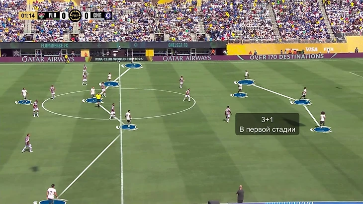 Сейчас над ее внедрением работает Мареска. В рамках этой структуры «Челси» уже неплохо двигает мяч и разыгрывает преимущество. Особенно интригует прием с созданием дополнительного этажа в построении – Палмер и Фернандес периодически отходили глубже, делая треугольник с опорником, а Гюсто оставался рядом с нападающим: