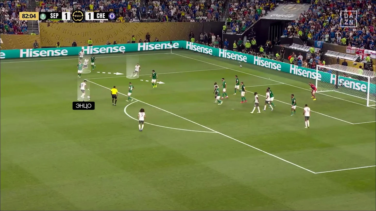 Задача доставить мяч игроку, который открывается в штрафной. Если он свободен, то можно прямым пасом. Если свободен другой игрок, то транзитом через него. Тут транзит обеспечил Энцо Фернандес:
