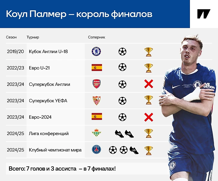 ● Палмер – звезда финалов: сейчас три результативных действия против «ПСЖ», всего семь в пяти решающих матчах. Детальнее: два ассиста в ЛК против «Бетиса», гол Испании на Евро-2024, а еще мяч «Севилье» в Суперкубке УЕФА – тогда еще играл за «Сити».