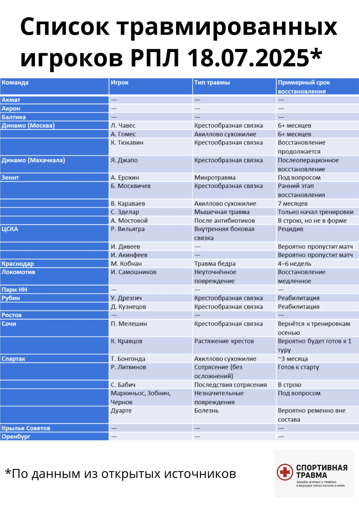 РПЛ-25/26, медицинское превью. Кто пропускает первый тур?