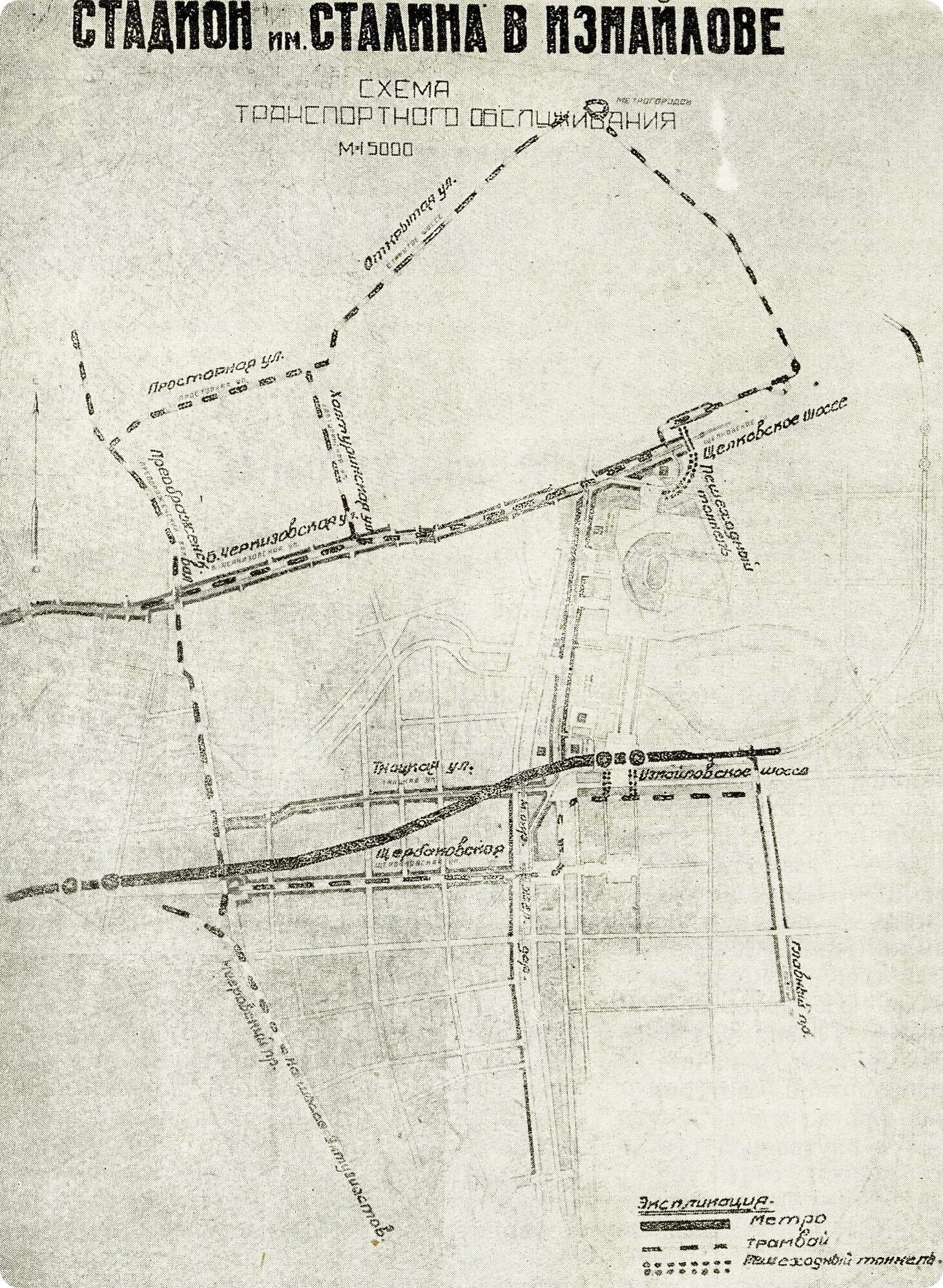 Заключение экспертов в ноябрьском номере «Строительства Москвы» от 1939 г. гласит, что и без стадиона наземный транспорт района сильно перегружен. На нем катаются жители села Калошино (ныне новостройки на Щелковском шоссе и остатки промзоны Гольяново), Измайловского стандартного городка (район нынешних Парковых улиц) и других близлежащих поселков.