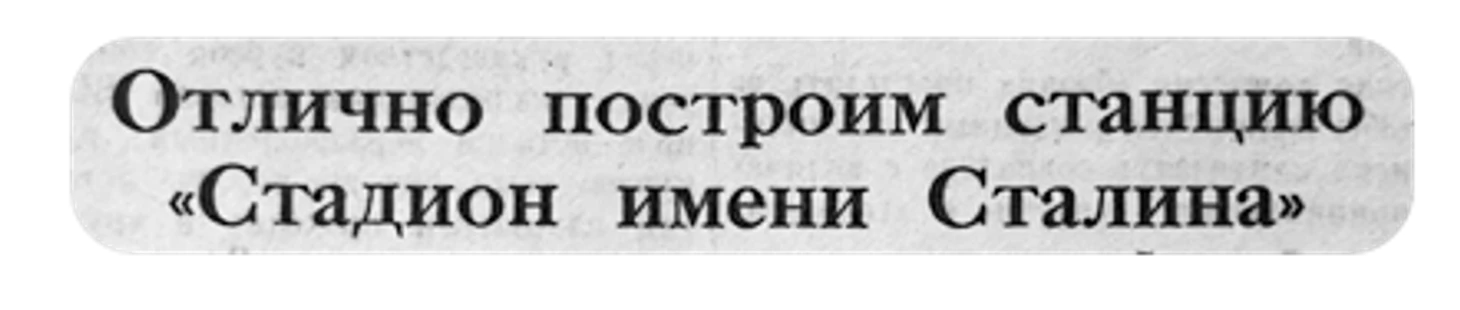 «На долю орденоносного коллектива строителей московского метрополитена выпала почетная задача – связать подземной магистралью лучшего в мире метро величайший стадион с центром столицы»