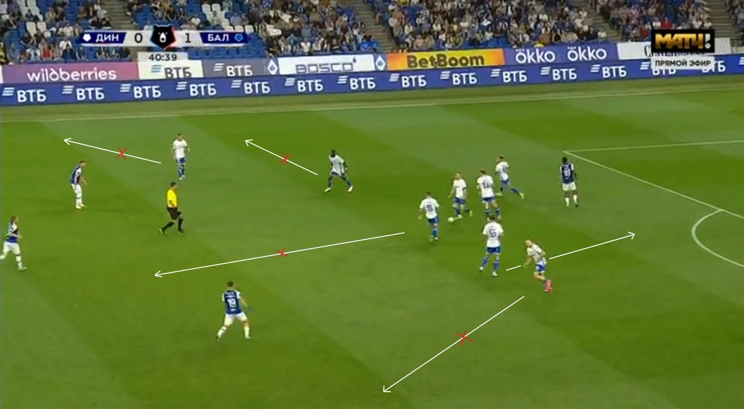 С первых минут стало ясно: лёгкой игры не будет. Но не потому, что Балтика показывала выдающийся футбол (хотя он был очень дисциплинированным) — это Динамо не могло найти собственную игру. Создавалось впечатление, что гости максимально обнажили слабые места москвичей: отсутствие командной комбинационной игры, уход лидеров в тень, открытые зоны в обороне. Когда атака начинается от вратаря, у него обычно есть три варианта продолжения: на фланг, по центру или, в худшем случае, выбить мяч на половину соперника, где за него придётся бороться. На 7-й минуте как раз и проявилась пассивность центра: Лунёв ждёт открывания центрального полузащитника, но, не дождавшись, отправляет мяч верхом направо на Глебова. На фото это не видно, но за нашими полузащитниками в центре, конечно, находятся игроки соперника. С одной стороны, такой розыгрыш может быть рискованным. Но, во-первых, потеря мяча в центре поля не так опасна (надеюсь, этот матч станет единственным исключением), как у своих ворот. А во-вторых, если полузащитник предлагает себя в центре, он оттягивает на себя соперника и тем самым создаётся свободная зона за его спиной.