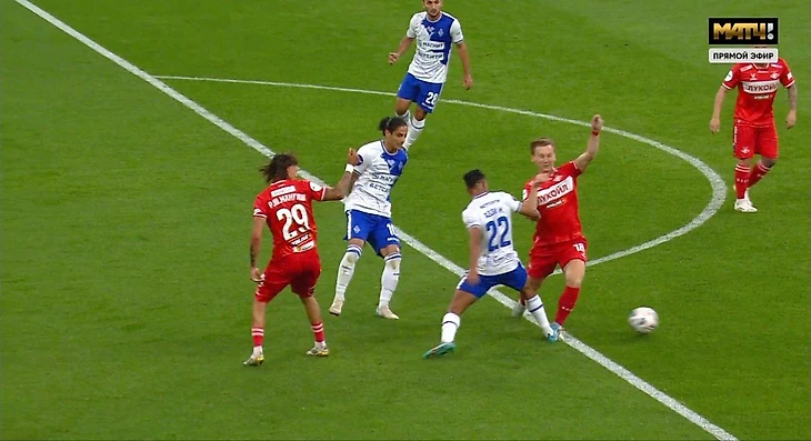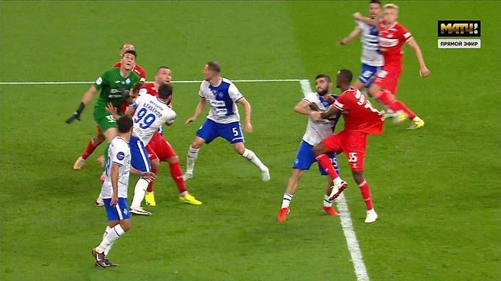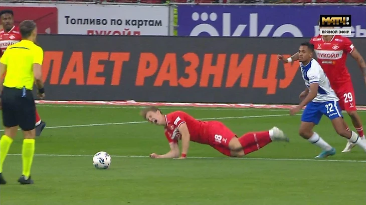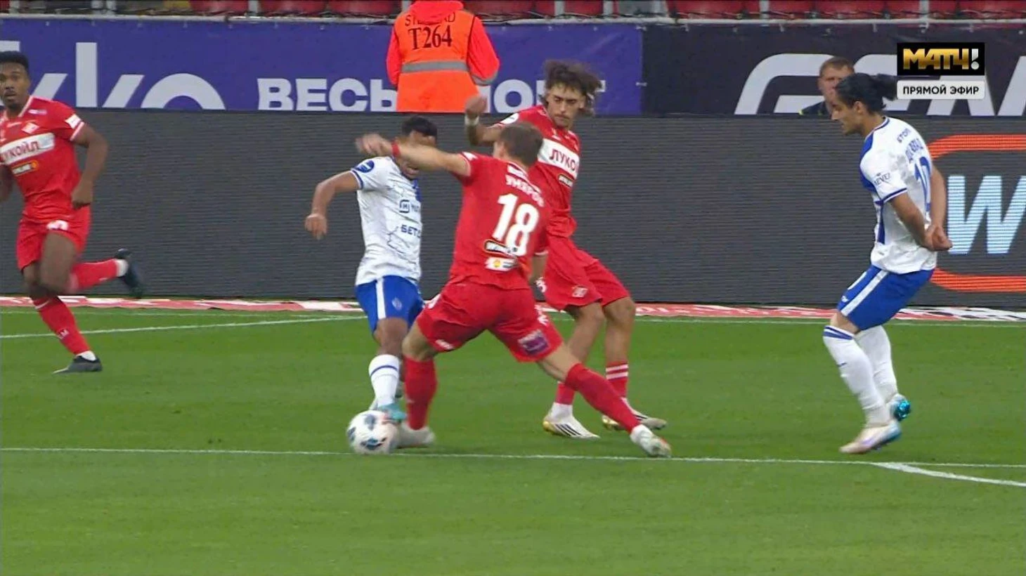 Динамовец Мохамед Аззи наступил на ногу полузащитнику «Спартака» Наилю Умярову – на линии штрафной. Если это нарушение – значит пенальти. Но главный судья Василий Казарцев продолжил игру.
