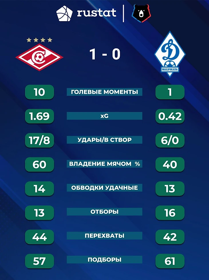 Посмотрим статистику игры и мы видим, что победа заслеженная. По атакующим показателям Спартак превзошел соперника.