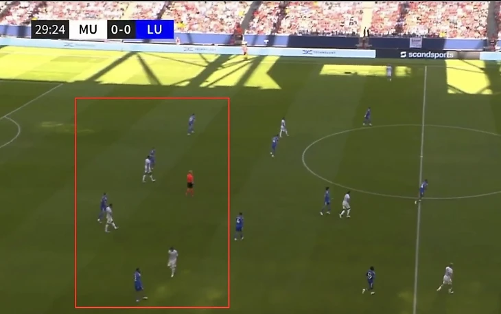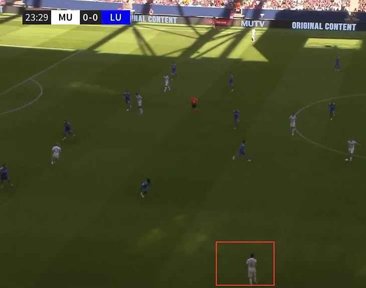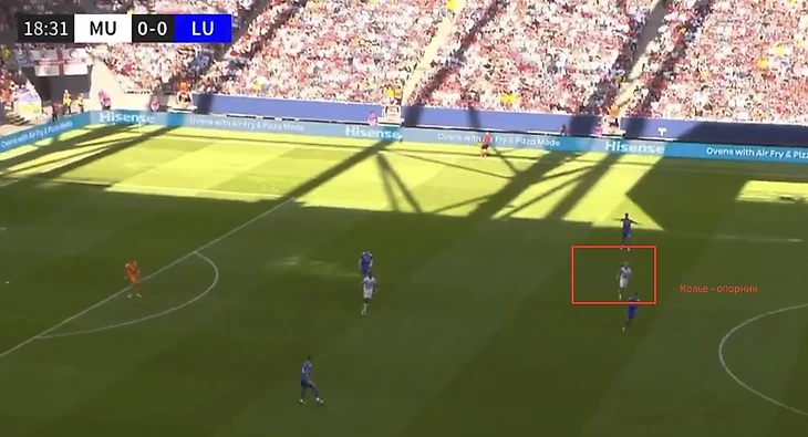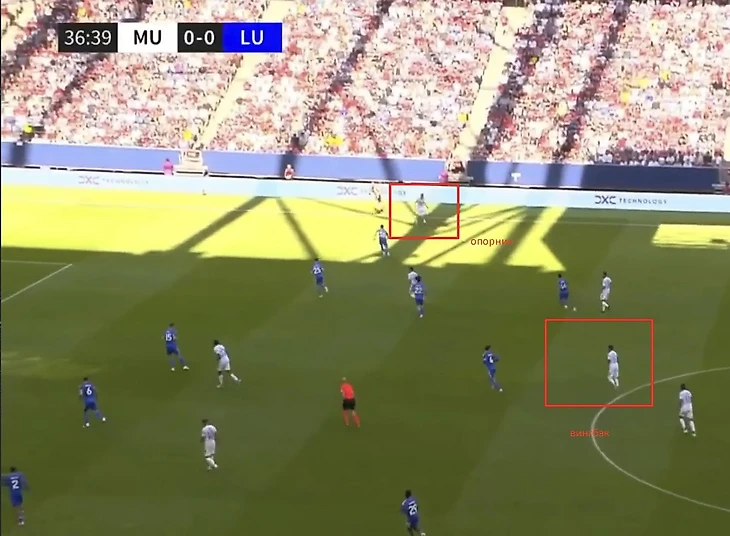Пример 1 – позиционная атака. Ребята из Лидса спокойно занимаются персональной опекой, а футболисты МЮ просто стоят и, вероятно, ждут длинный пас, якобы в попытках использовать потенциальное численное преимущество засчет базиса 3-2-5. Проблема в том, что в команде нет ни одного футболиста, который может выигрывать хотя бы половину верховых дуэлей и цепляться за такие мячи. Единственный рабочий вариант – вторая картинка, диагональ на фулбэка в изоляцию (привет, Эрик) или даже в свободную зону. А что дальше? А хрен его знает (нет сильных фулбэков):