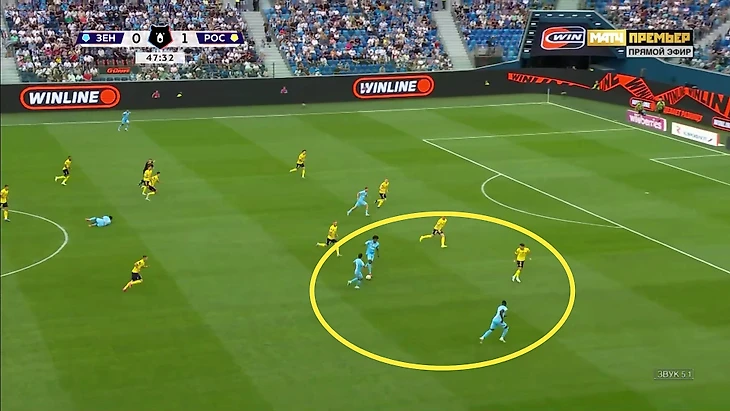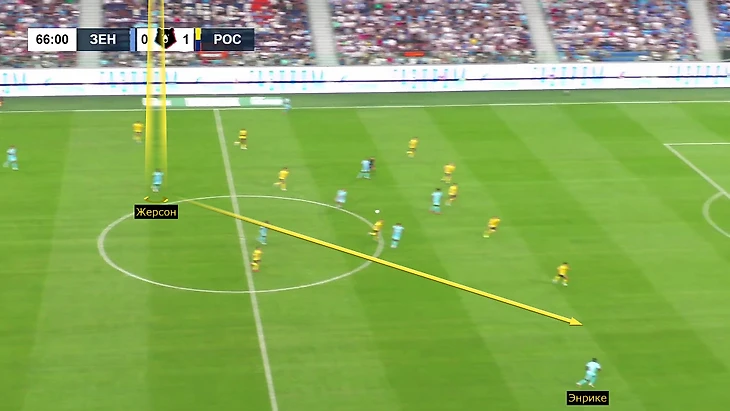 Но ситуацию спас Жерсон – его появление в паре с Барриосом ускорило игру. Он изменил все: придерживал мяч, отдавал топовые диагонали на фланг, разрезал линии и приходил на два фланга. Быстрые решения Жерсона вернули изоляции для Луиса Энрике: раньше «Зенит» долго катал мяч, и его накрывали два или три защитника (это еще и выключало Мантуана), с новичком появились ситуации один в один.