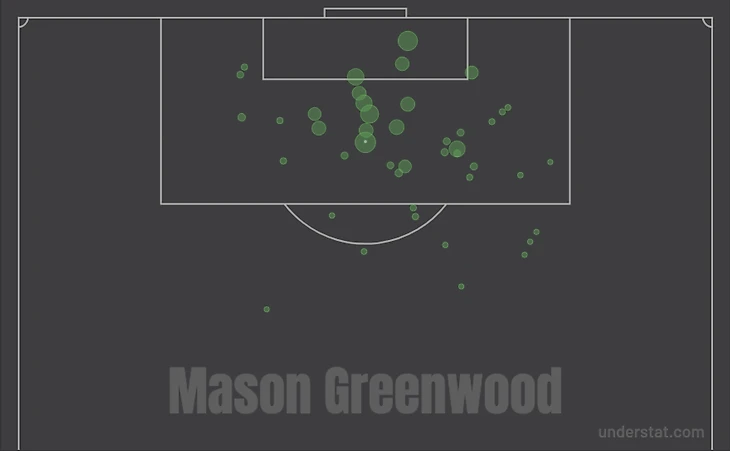 Догадаетесь, откуда бьет Гринвуд? Конечно, зачастую из-за штрафной. Так он забил 10 раз – хороший результат, но не грандиозный. Многие центральные полузащитники превосходят Гринвуда. И не только они: у Кейна 17 голов из-за штрафной с сезона-2018/19 (учитываются только голы в топ-лигах), у Мбаппе – 20, у Месси – 23.