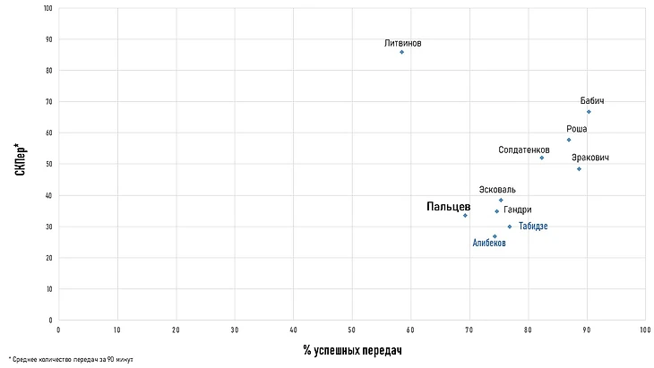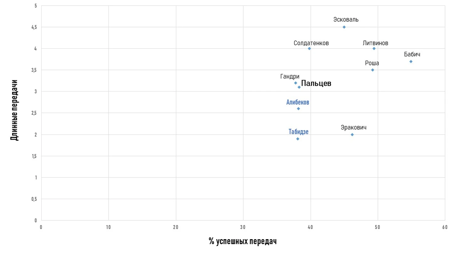 Пальцев по общему показателю выполненных передач за матч и проценту их точности входит в группу аутсайдеров. Безусловно, стоит учитывать тот факт, что защитники команд из нижней части турнирной таблицы не могут выполнять схожее количество передач, что и защитники команд, владеющих мячом. Однако, точность передач также находится на сравнительно низком уровне. Рассмотрим данные по точности и количеству длиных передач на 90 минут: