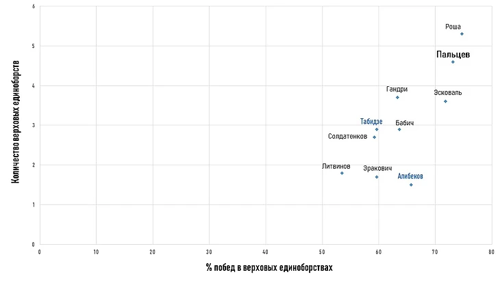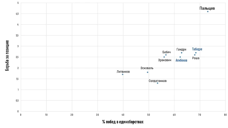 Особого внимания заслуживает умение Пальцева действовать в позиционных единоборствах. Обратимся к статистике: