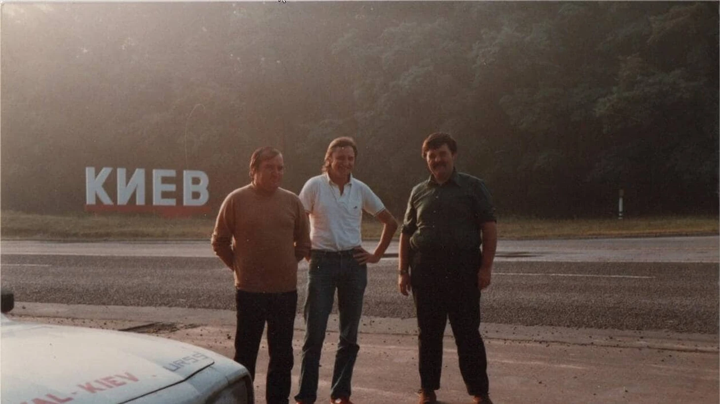 Сентябрь 1983. Didier Daburon (справа) с друзьями, на въезде в Киев. На капоте его Peugeot 504 самодельная наклейка Лаваль – Киев.