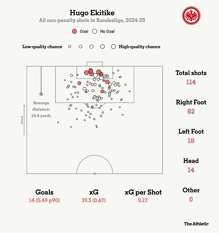 В прошлом сезоне Экитике нанес 4,1 удара за 90 минут, что поставило его на четвертое место среди всех игроков Бундеслиги, которые провели на поле не менее 900 минут, но он не дозабил 6,6 гола по xG, что является худшим показателем в лиге (15 голов при показателе xG 21,6). Эта область его игры нуждается в доработке.