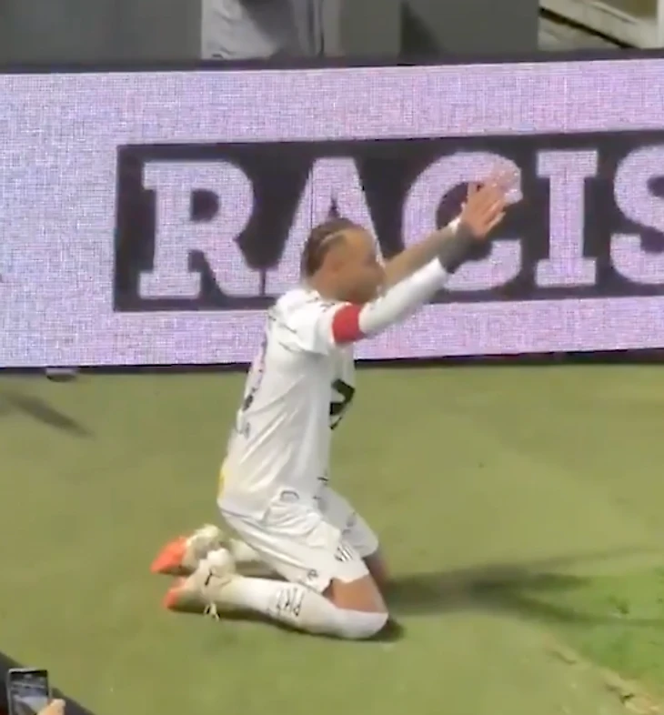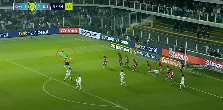 Основное время матча «Сантос» проиграл 0:2, но на 90+1 Альваро Барреаль зажег надежду – точно пробил под перекладину с близкого расстояния.