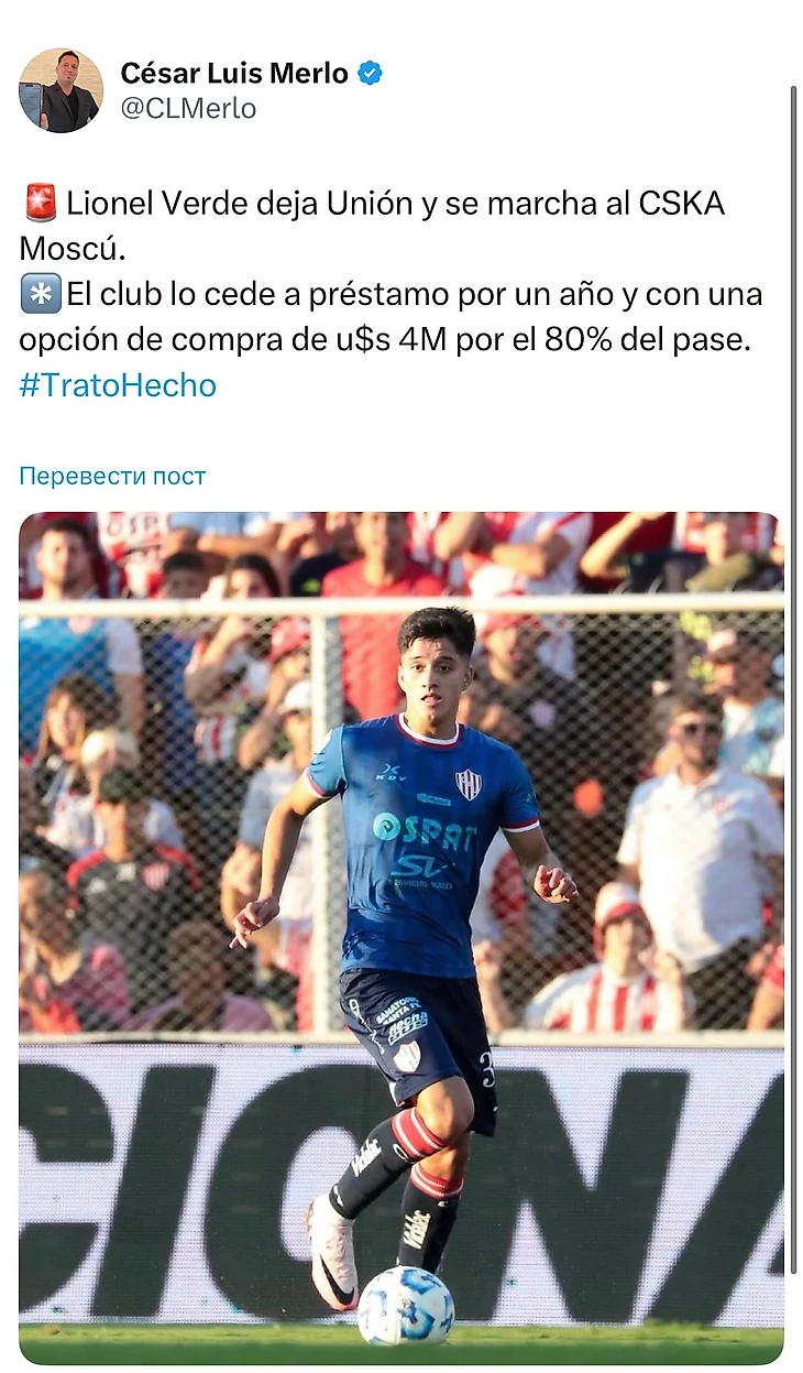 По аргентинцу Лионелю Верде, который действительно летит в Москву и должен стать футболистом ЦСКА. Центральный полузащитник, которому в октябре исполнится 21 год. Подвижный, ловкий, хорошо видит поле. Если коротко: восьмерка, больше тяготеющая к атаке, нежели к обороне. Важный момент: это игрок в ротацию. Будем надеяться, сумеет себя проявить и навязать конкуренцию. Скажем, его ровесник 20-летний Матеус Алвес в своем первом же матче против «Оренбурга» оставил приятное впечатление, и не удивлюсь, если в самое ближайшее время мы увидим его в стартовом составе ЦСКА.