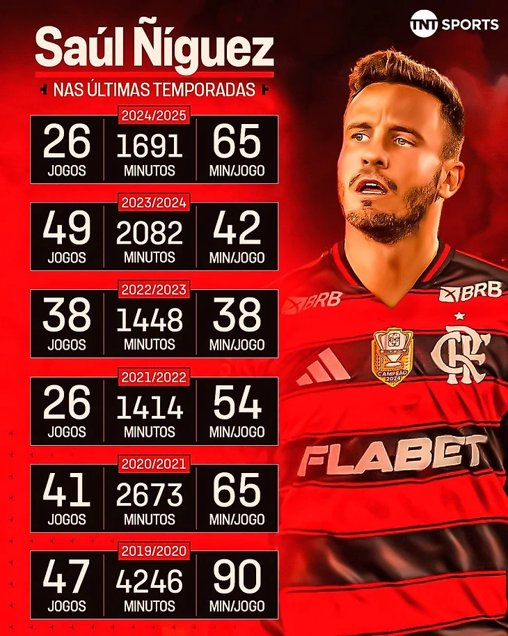 Если сделка по нему срастется, то в составе Фла будет два экс-игрока «Атлетико». Накануне свободным агентом подписан Сауль. Смущает, что игровое время испанца последние 5 сезонов шло явно по нисходящей.